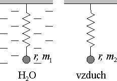Mame dve rovnako velke gulicky s polomerom r zavesene na rovnakych pruzinkach s tuhostou k. Hmotnosti guliciek su m1 a m2. Prva gulicka je ponorena vo vode, druha vo vzduchu ako na obrazku. Urcte pomer m1/m2, ak po vychyleni guliciek o rovnaku malu vzdialenost: