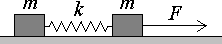 Na stole lezia dva rovnake kvadriky spojene pruzinou s tuhostou k, ktora je neroztiahnuta (ma dlzku l0). Na pravy kvadrik zacneme posobit konstantnou silou F. Aka bude maximalna a minimalna vzdialenost kvadrikov pocas ich pohybu? Trenie zanedbajte.
