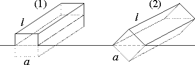 Vo vode s hustotou 1000 kg/m3 je ponoreny dreveny hranol s hustotou 500 kg/m3 so stvorcovou podstavou a dlzkou l vacsou nez a. Ktora z poloh (1), (2) je stabilna?