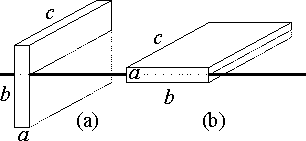 Majme drevenu dosku s rozmermi a < b < c. Co musi platit pre jej hustotu, aby vo vode plavala podla obrazka a), resp. podla obrazka b)? Hustota vody je r0.