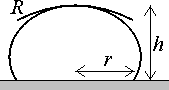 Kvapka lezi na stole a ma tvar, ktory je nakresleny na obrazku. Jej vyska je h, polomer krivosti jej povrchu v najvyssom bode je R a polomer plochy, ktorou sa dotyka stola je r. Kvapalina nezmaca stol. Vypocitajte tiaz kvapky, ak jej hustota je r.