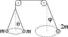 Pre ake hodnoty uhlov f, q, bude system v rovnovahe? Vsetko je idealne a bez trenia. Gulicky vykonavaju rovnomerne pohyby po kruzniciach.