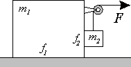 Vypocitajte zrychlenie telesa s hmotnostou m1, ak pozname silu F. f1 a f2 su prislusne koeficienty smykoveho trenia medzi podlozkou a kvadrom a medzi kvadrami navzajom a m1, m2 su hmotnosti jednotlivych kvadrov tak, ako su oznacene na obrazku.