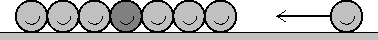 Na rovine lezia gule rovnakeho rozmeru. Jedna (pozri obrazok) je vyrobena z ocele, ostatne su vyrobene z dreva. Na gulicky nalietava drevena gula, rovnaka ako ostatne drevene. Ako sa budu gulicky pohybovat po naraze?
