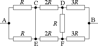 Najdite odpor schemy medzi bodmi: a) A a B; b) C a D; c) E a F.