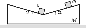 Na vodorovnej rovine je položený vyhlodaný hranol hmotnosti M (pozri obrázok), ktorý sa po nej môže bez trenia pohybovať. V najnižšom mieste leží kocôčka s hmotnosťou m. Na naklonenej časti hranolu leží kocôčka hmotnosti m. Aj malé kocôčky sa môžu pohybovať po vyhlodanom hranole bez trenia. Aká musí byť splnená podmienka pre hmotnosti M, m a m a uhol a, aby sa po uvoľnení kocôčky m kocôčka m začala voči hranolu M pohybovať?