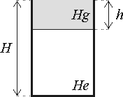 V nádobe tvaru valca s prierezom S a výškou H je hélium, uzavreté ľahkým piestom. Na pieste je naliata ortuť až po okraj nádoby, teda do výšky h tak, ako na obrázku. Nad povrchom ortuti je atmosferický tlak pa. Systém je v rovnováhe, teplota okolia je T0. Uvažujte izotermický dej v plyne a určte minimálnu hodnotu h, pri ktorej je ešte systém v stabilnej rovnovážnej polohe. Ak by sme uvažovali adiabatický dej, bola by spomínaná minimálna hodnota h väčšia, alebo menšia?