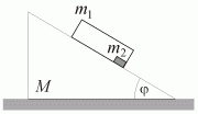 A-1.4 Kváder v kvádri (5 bodov) Na naklonenej rovine je dutý kváder hmotnosti m1 a v ňom malý kvádrik hmotnosti m2 (pozri obrázok). Naklonená rovina má sklon j a hmotnosť M, trenie medzi všetkými zúčastnenými telesami je nulové. Sústavu držíme nehybnú, po uvoľnení sa dá do pohybu. Aké zrýchlenie má malý kvádrik vzhľadom na: a) naklonenú rovinu, b) veľký kváder. Tento seminár je organizovaný s podporou