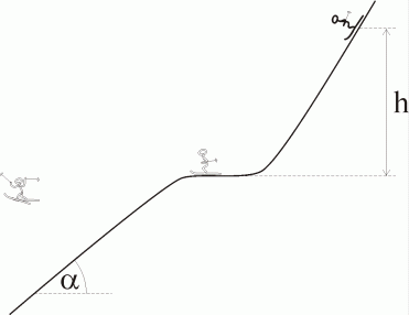 Lyžiar-skokan sa púšťa z výšky h = 50 m. Na konci mostíka je krátky vodorovný úsek (na rozdiel od skutočných skokanských mostíkov). Lyžiar sa zabudol odraziť a už letí vzduchom. Doskočisko je svah so sklonom a = 30°. Vypočítajte, ako ďaleko od hrany mostíka sa dotkne zeme. Odpor vzduchu i trenie na mostíku zanedbajte. Skúste pouvažovať nad reálnymi mostíkmi, čo všetko sa zmení? B-3.2 Závažíčka (5 bodov)