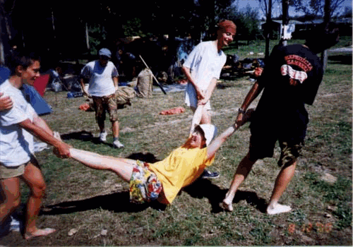 V hlavnej úlohe: Luciška, Irmo, Šimlo a Dávidko. Kladný hrdina: FoX. Táák, a môže sa predstavenie začať. Ale najprv si povedzme ako sa to všetko vlastne začalo:...."Irmo, ty si hrdina! Já te žeru!" ozývalo sa od Lucišky. "Irmo, ako to ty robíš!!! Si proste hrdina!" opäť nedala Luciška. Takto to poračovalo až do večera. Mesiac sa už štveral na svoje miesto a všetcia sme pozaspávali. Niektorí ľahšie, iní naopak premýšľali nad tým, čo a ako na druhý deň. Ráno: Slnko páli sťa na Sahare, balíme stany (tí aktívnejší) a tí menej aktívny iba ležia v tráve s tým, že sa cítia dosť blbo. Zrazu len počuť: "Irmo, ty si hrdina...!" a obrovský smiech. To už pravdepodobne Irmovi nedalo a zogranizoval (vlastne ani nemusel organizovať, každý sa s radosťou pridal) akciu za utopenie Lucišky. Ale samozrejme, ako v každej rozprávke so šťastným HAPPY-endom, Luciške prišiel pomôcť kladný hrdina. Tejto role sa dobre zhostil FoX, ktorý ju obraňoval rukami-nohami. Ale veď to poznáte, zlo musí byť potrestané a ani taký "princ" ako FoX jej napokon nepomohol.Tak po chvíle prehovárania, nútenia a násilia Luciška skončila v špinavých vodách Hrona (chúďa, pozn. autorky). Trochu mokrá, rozrušená a mierne nahnevaná :) sa nalodila a pokračovalo sa v ceste. Ešte šťastie, že sme to už domov nemali tak ďaleko. |